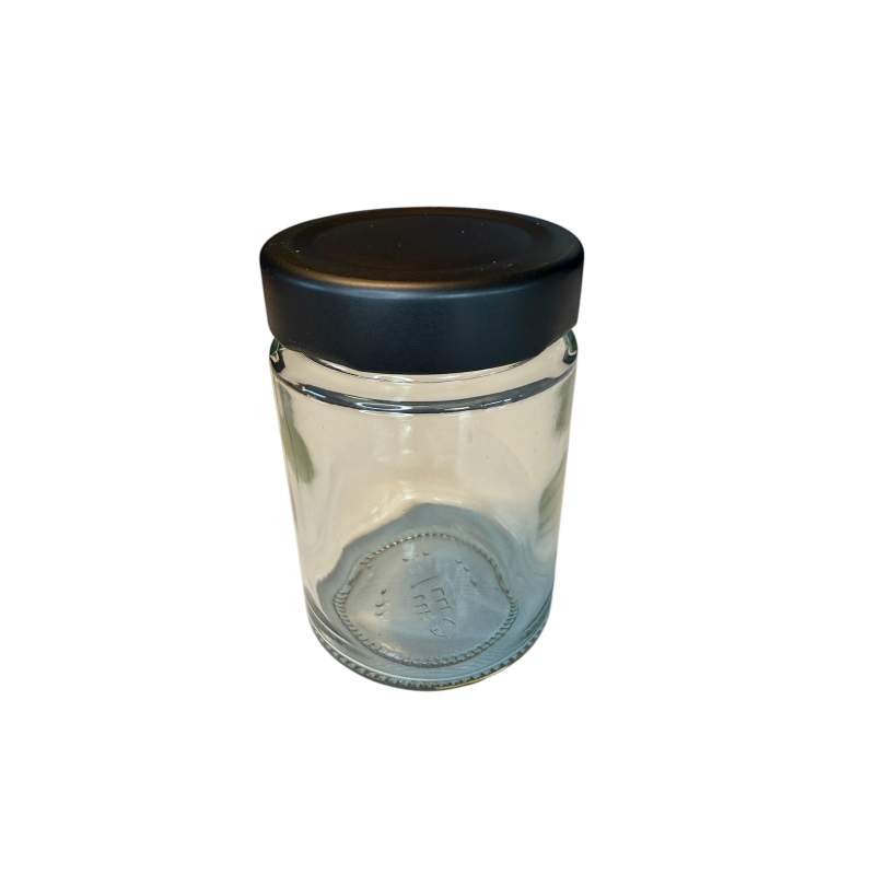 Leeres Gewürzglas, 192 ml Füllkapazität. Mit schwarzem, mattem Deckel. Passgenau für alles was es bei uns an Gewürzen im Glas gibt. Für Suppe bitte das Suppen Glas bestellen – es hat mehr Füllkapazität.